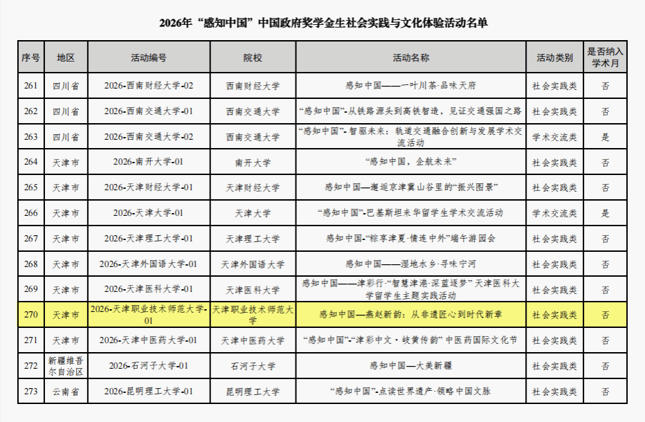 “感知中国”是国家留学基金委重点打造的国家级品牌活动,旨在组织来华留学生走出课堂、深入社会,通过沉浸式国情考察与文化体验,增进对中国历史文化、发展成就与社会现实的全面认知,促进中外青年交流互鉴、民心相通。“感知中国 燕赵新韵:从非遗匠心到时代新章”项目紧扣“非遗传承、京津冀协同发展、文化守正创新”主线,计划于2026年6月中旬在天津、河北两地开展,面向中外青年开展线下社会实践,全程突出沉浸式、互动式、探究式体验设计。
